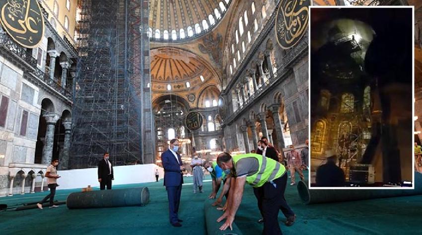 Ayasofya Camii, 86 yıl sonra yeniden ibadete açılmak için artık saat sayıyor. Bir yandan caminin halıları serilirken diğer yandan da ses sistemi deneniyor.