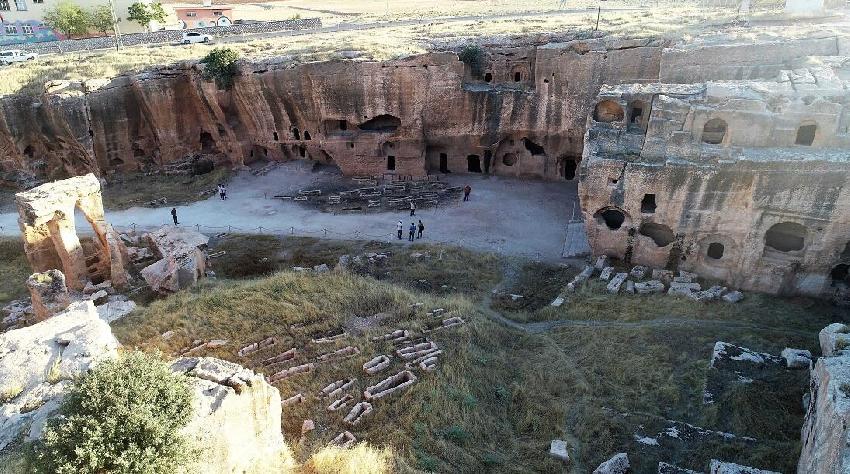 İnsana ait kemiklerin bulunduğu galeri mezarla ilgili görüşlerin bilimsel çalışmalarla desteklenmesi gerektiğini vurgulayan Doç. Dr. Metin, “Galeri mezarı olarak adlandırılan yer en çok ziyaretçi çeken alanlardan birisidir. İmparator Anastasyus garnizon kenti olarak buraya karar kıldıktan sonra bu alanlar ilk önce kentin sur duvarları ve kamusal yapıları için taş ocağı olarak kullanılmış. Burada geniş bir alan oluşturulduktan sonraki evrede belli bölümlerde mezar yapıları kullanılmış. Bu mezar yapıları farklı niteliktedir. Arkasolium mezarlar, basit sanduka mezarlar ve en dipte dünyada eşi benzeri olmayan bir galeri mezar yapısına sahip. Bu alan Dara’yı diğer tüm antik kentlerden ayıran galeri mezar olarak adlandırılan yapıdır. Mezarın giriş kısmında Hazreti İsa’nın yani Ortodoks inancına ait çeşitli betimler bulunmaktadır. İç kısımda ise çift katlı bir yapı mevcut. Üst katında çeşitli sanduka tipinde ölü yatakları bulunmaktadır. Bu mezarlarda Hıristiyanlık inancına göre bir dizim yoktur. Yani mezarlarda herhangi bir yön yoktur. Bu mezarı diğer tüm antik dönem mezarlarında farklı kılan yanı en alt kısımda bulunan ve gelişi güzel bir şekilde olan yüzlerce insana ait kemik parçasının bir arada bulunmasıdır. Bununla ilgili farklı görüşler bulunmaktadır. En makul görüş bu mezarların o dönem sandukalarda bulunan kemik parçalarının daha sonra gömü yapılmasıyla birlikte aşağı kısma aktarılmasıdır veya 530 yılında Pers-Sasani savaşlarında ölen askerlerin buraya toplu olarak gömülmüş olması şeklinde yorumlar var” dedi.