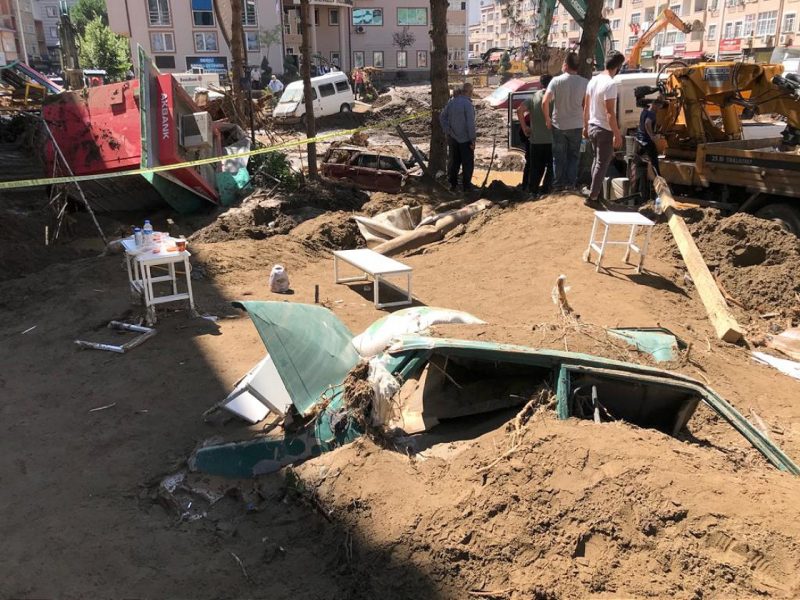 İlçe merkezine dere taşkını ile sürüklenen taş, kum, toprak ve kaya parçaları iş makinalarıyla kaldırılırken, Giresun İl Özel İdaresi, DSİ, Giresun Belediyesi ve diğer ekipler çalışmalarını sürdürüyor.