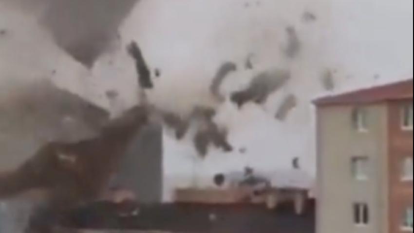 Çatıdan kopan büyük parçalar rüzgarın etkisiyle havada savrulurken, felaketin boyutu da gözler önüne serildi.