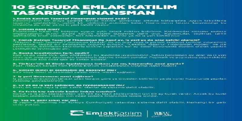 1-Emlak Katılım Tasarruf Finansman sistemi nedir? Katılımcıların bir araya gelerek Emlak Katılım güvencesi altında bütçelerine uygun taksitlerle tasarruf sağladıkları; belirli bir birikimin ardından kalan finansmanın faizsiz karşılandığı bu sistemde ev, araç ya da çatılı iş yeri sahibi olunur.