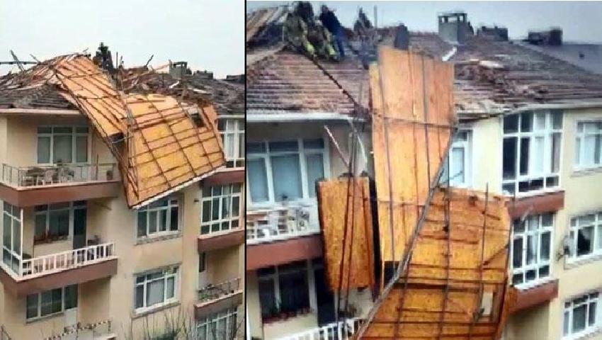 Binanın üst katında oturan Hilal Akan, fırtınanın şiddetini arttırması ile birlikte çok büyük bir gürültü ile irkildiklerini, çatı savrulurken tavadan tozlar döküldüğünü belirtirken “Yola düşse büyük facia olabilirdi” dedi.