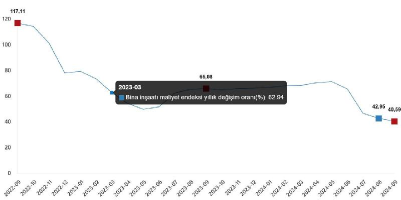 İnşaat maliyeti endeksi ağustosta yüzde 1,18 artarken, yıllık bazda artış yüzde 41,54 olmuştu ve 3 yılın en düşük seviyesine gelmişti. Eylülde de yıllık bazda en düşük seviyede kalmaya devam etti.