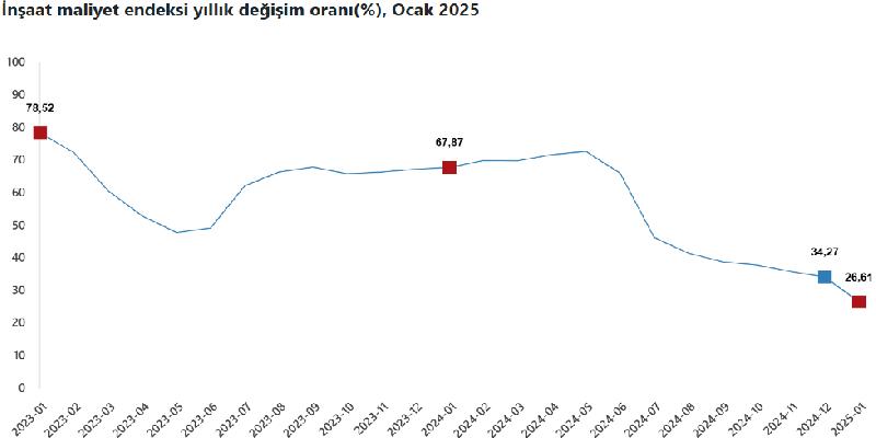 Türkiye İstatistik Kurumu (TÜİK) ocak ayı inşaat maliyet endeksi verilerini yayımladı. Buna göre İnşaat maliyet endeksi, 2025 yılı ocak ayında bir önceki aya kıyasla yüzde 9,10 oranında artış gösterdi. Geçen yılın aynı ayına göre ise yükseliş yüzde 26,61 olarak kaydedildi. İnşaat maliyetinde yıllık artış Aralık 2020’den beri en düşük seviyeye inerken, aylık bazda son bir yılın en büyük artışı gerçekleşti.