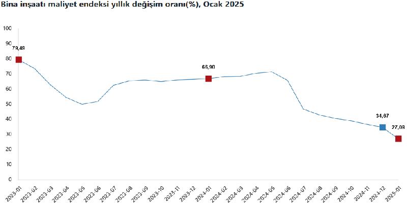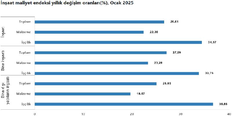 Bina inşaatı maliyet endeksi de Ocak ayında artış göstererek, bir önceki aya göre yüzde 9,39, yıllık bazda ise yüzde 27,09 oranında yükseldi. Bu dönemde malzeme endeksi yüzde 1,91, işçilik endeksi ise yüzde 24,14 oranında arttı. Ayrıca bir önceki yılın aynı ayına göre malzeme endeksi yüzde 23,28 arttı, işçilik endeksi yüzde 33,76 arttı.