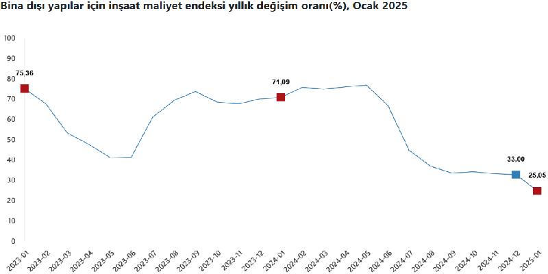 Bina dışı yapılar için inşaat maliyet endeksi, bir önceki aya göre yüzde 8,13 arttı, bir önceki yılın aynı ayına göre yüzde 25,05 arttı. Bir önceki aya göre malzeme endeksi yüzde 2,14 arttı, işçilik endeksi yüzde 21,58 arttı. Ayrıca bir önceki yılın aynı ayına göre malzeme endeksi yüzde 19,67 arttı, işçilik endeksi yüzde 36,65 arttı.