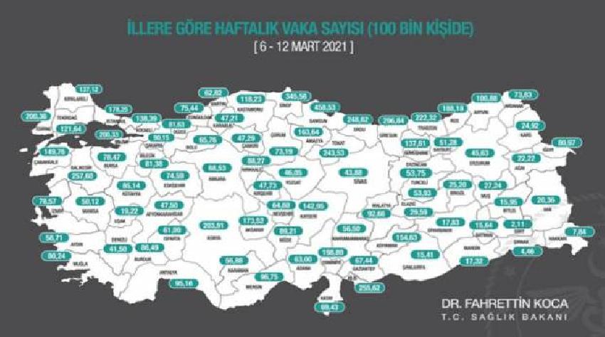 Sağlık Bakanı Fahrettin Koca’nın paylaştığı vaka sayısı haritasına göre 6-12 Mart 2021 tarihleri arasında oransal olarak en çok vakanın görüldüğü iller yine Karadeniz Bölgesi’nden çıktı. İl bazlı koronavirüs haritasında geçen hafta 100 bin kişide 348,36 olan Samsunda bu oran 458,53’e yükseldi.