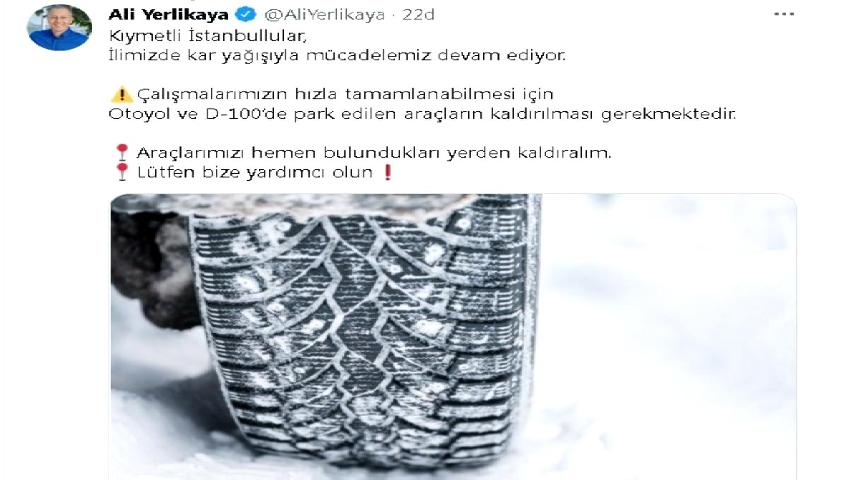 İstanbul Valisi Ali Yerlikaya sosyal medya hesabından araçların kaldırılması çağrısında bulundu