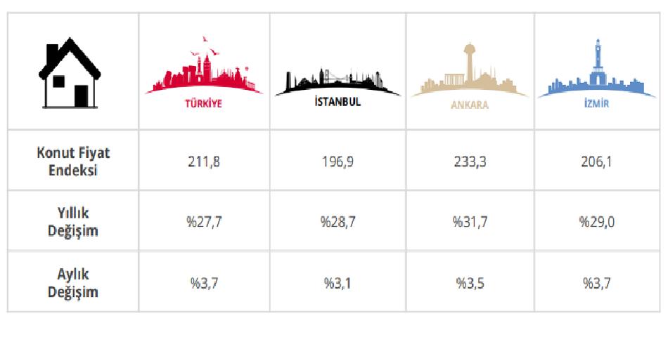 Endeks, yıllık bazda nominal olarak yüzde 27,7 artış kaydederken, aynı dönemde reel olarak yüzde 2,3 oranında azaldı. Böylece konut fiyatlarında enflasyona göre sınırlı gerileme yaşadı.