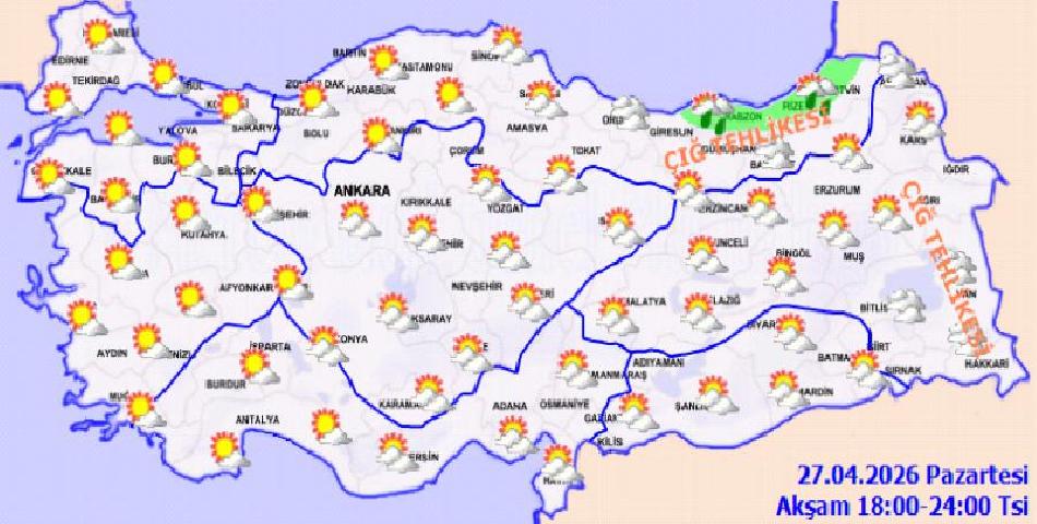 ANKARA (İGFA) – Meteoroloji Genel Müdürlüğüİ 27 Nisan Pazartesi gününe ilişkin hava tahmin raporunu yayımladı. Yapılan son değerlendirmelere göre,ülke genelinde parçalı ve çok bulutlu, Orta ve Doğu Akdeniz, Doğu Karadeniz, Doğu ve Güneydoğu Anadolu ile Burdur, Karaman, Niğde, Nevşehir, Aksaray, Kayseri, Sivas, Bolu, Tokat ve Ordu çevreleri ile Antalya ve Samsun’un iç kesimlerinin aralıklı sağanak ve gök gürültülü sağanak yağışlı geçeceği tahmin ediliyor.