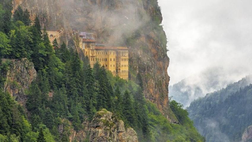 Karadağ’ın Altındere Vadisi’nde 300 metre yükseklikte kayalar oyularak inşa edilen Sümela Manastırı, sisli ve yağmurlu havalarda da ziyaret ediliyor.