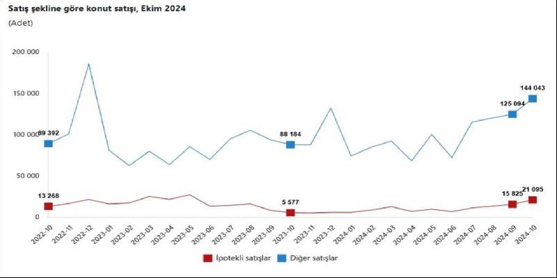 İpotekli konut satışları ekim ayında bir önceki yılın aynı ayına göre yüzde 278,2 oranında artarak 21 bin 95 oldu. Toplam konut satışları içinde ipotekli satışların payı yüzde 12,8 olarak gerçekleşti.