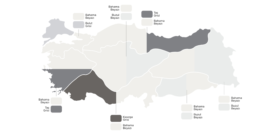 2020 yılında Türkiye genelinde, dış cephelerde en çok beyaz ve tonları tercih edildi. Şehir siluetlerinde daha sade, göz yormayan renkler ön plana çıktı. Trakya’nın “Bulut Grisi” renk tercihi dışında, neredeyse tüm bölgelerimizde, “Bahama Beyazı” en çok kullanılan renk oldu. Dış cephede gri tonları listeleri sıkı bir şekilde zorlarken Türkiye genelinde en çok öne çıkan renkler, “Taş Grisi”, “Kasırga Grisi”, “Buzul Beyazı”, “Atlas Mavisi”, “Kar Beyazı”, “Fildişi Sahili”, ve “Poyraz” oldu.