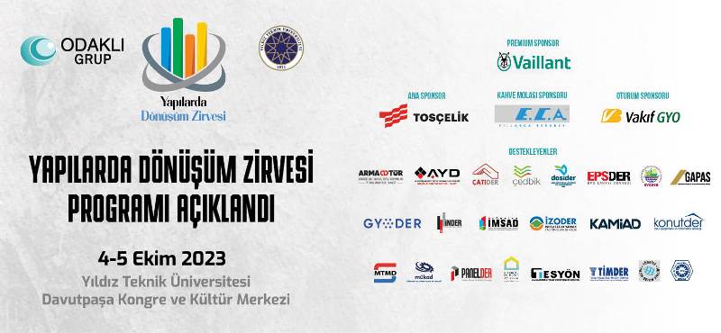 Yıldız Teknik Üniversitesi ve Odaklı Grup iş birliği ÇEDBİK, GYODER, İNDER, KONUTDER, MTMD, Türkiye İMSAD ve sektör derneklerinin destekleriyle düzenlenecek olan “Yapılarda Dönüşüm Zirvesi” 4-5 Ekim 2023 tarihlerinde Yıldız Teknik Üniversitesi Davutpaşa Kongre ve Kültür Merkezi’ndedüzenlenecek olan “Yapılarda Dönüşüm Zirvesi”nin programı açıklandı.