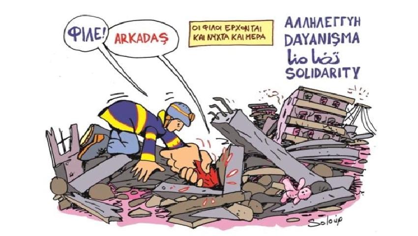 Bu dayanışma Türkiye’de takdir toplarken, Yunanistan’da Topontiki dergisinin çizeri Soloup da karikatüründe dostluğu vurguladı.
