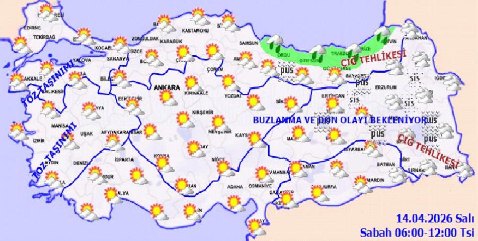 Sabah ve gece saatlerinde özellikle doğu bölgelerde buzlanma, don, pus ve yer yer sis etkili olacak.
